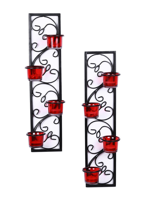 Hosley Set of 2 Decorative Wall Sconce With Red Glass and Free T-light Candles (Black Matte)