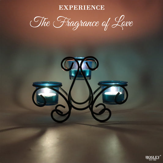 Hosley Tealight Candle Holder Metal Table Top Candle Holder with Blue Glasses and Tealight
